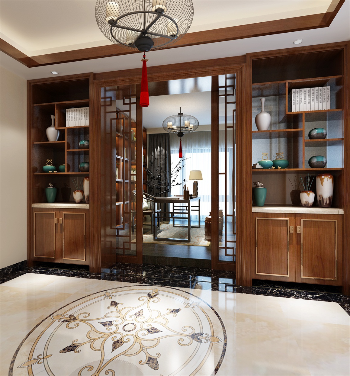 黑金花大理石線條、微晶磚、紅檀飾面板、拋釉磚等