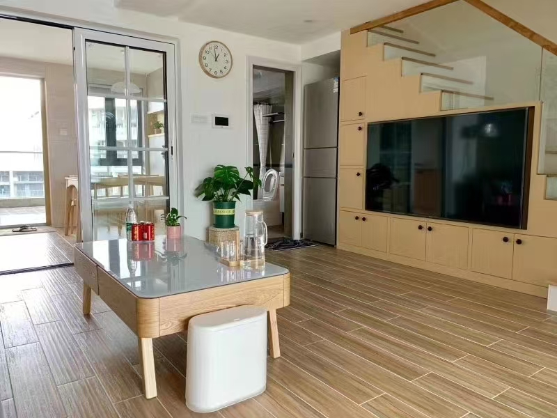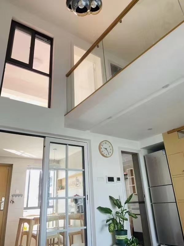 采用簡約直梯設(shè)計(jì),踏步選用實(shí)木材質(zhì),扶手搭配玻璃與玻原木扶手