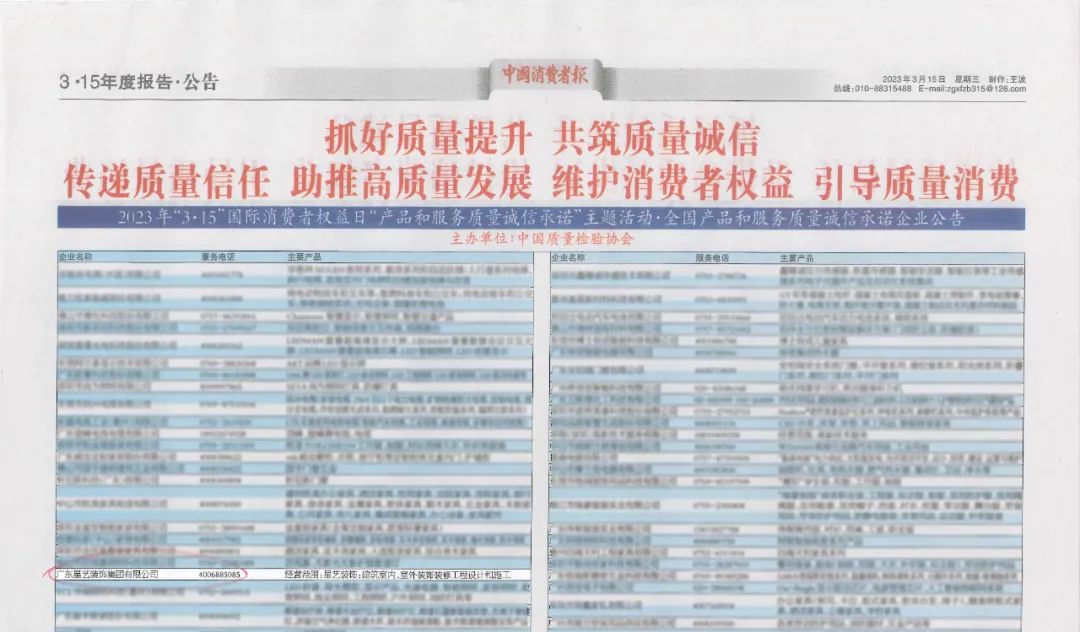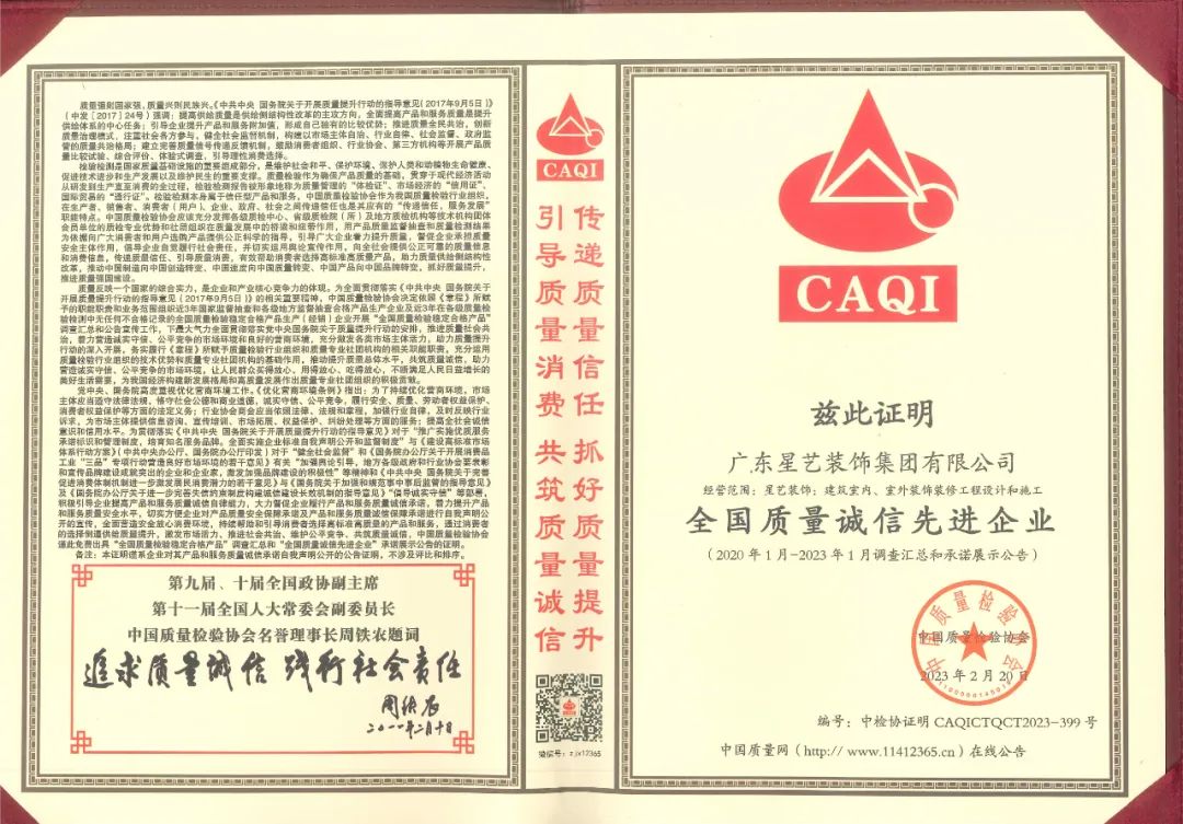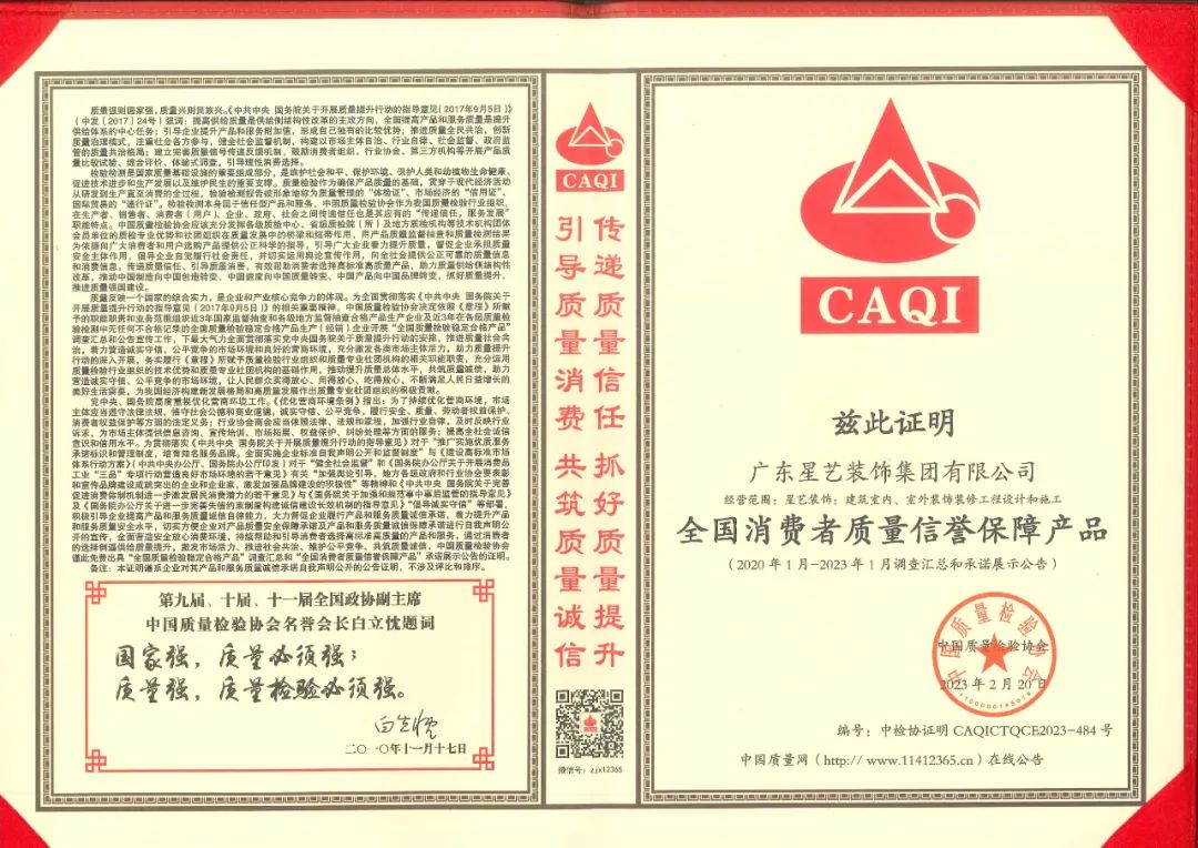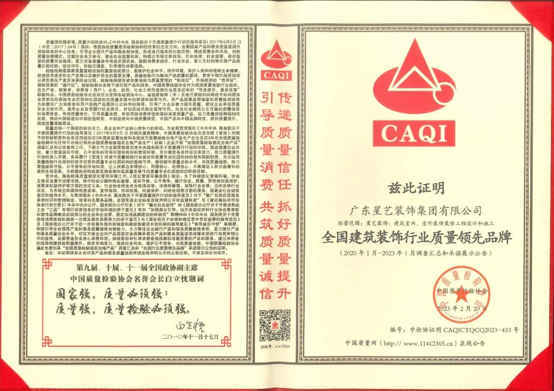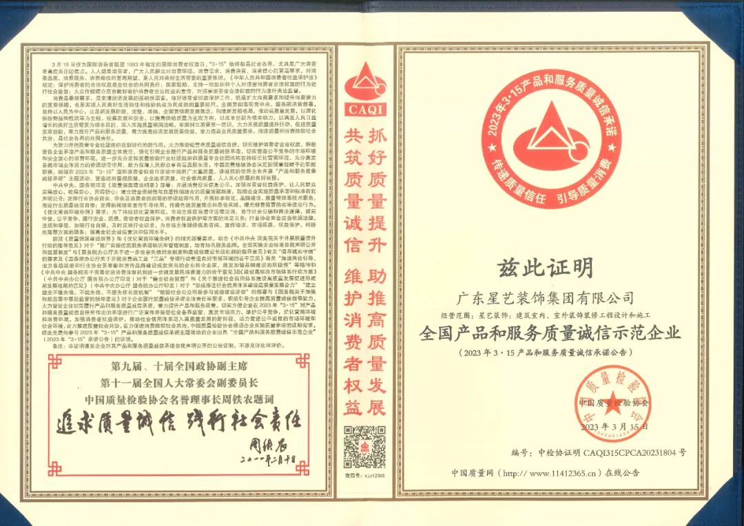 近日,2020年1月-2023年1月調查匯總和承諾展示公告和2023年3·15產品和服務質量誠信承諾公告,星藝裝飾憑借在產品品質、服務質量、誠信經營等方面的突出表現(xiàn),榮獲中國質量檢驗協(xié)會頒發(fā)的“全國建筑裝飾行業(yè)質量領先品牌”“全國消費者質量信譽保障產品”“全國質量誠信先進企業(yè)”和“全國產品和服務質量誠信示范企業(yè)”榮譽認證。