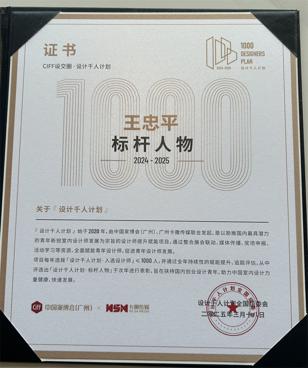 經(jīng)專家嚴(yán)格審核篩選,完成對(duì)設(shè)計(jì)師的年度追蹤評(píng)估。設(shè)計(jì)師王忠平憑借卓越的行業(yè)表現(xiàn)、優(yōu)秀的落地作品以及對(duì)設(shè)計(jì)事業(yè)的深厚熱情,成功脫穎而出,榮獲「設(shè)計(jì)千人計(jì)劃」的最高榮譽(yù)——標(biāo)桿人物。