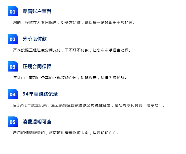 星藝裝飾深知,信任的基石,首先是資金的安全。我們提出:“??顚S?,多重監(jiān)管,資金安全有保障”,這并非一句空話,而是有34年品牌實(shí)力托底的堅實(shí)承諾。