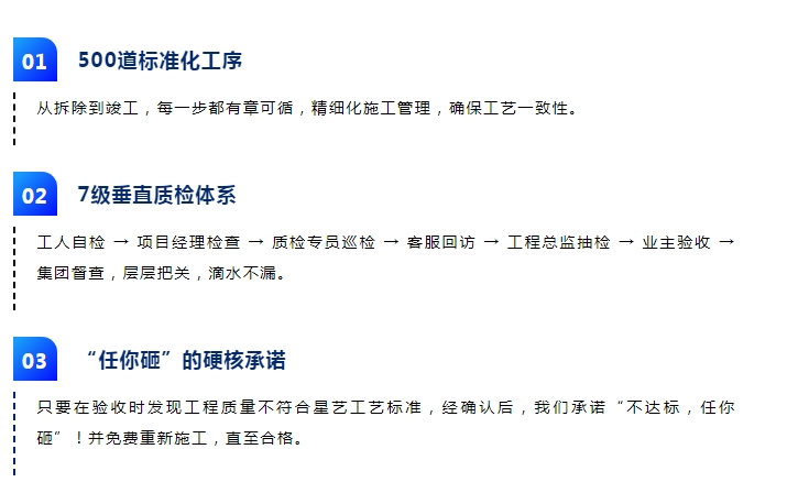 工期拖延、工藝粗糙?星藝500道工序+7級質(zhì)檢,敢承諾:工程質(zhì)量不合格,砸掉免費(fèi)重做!